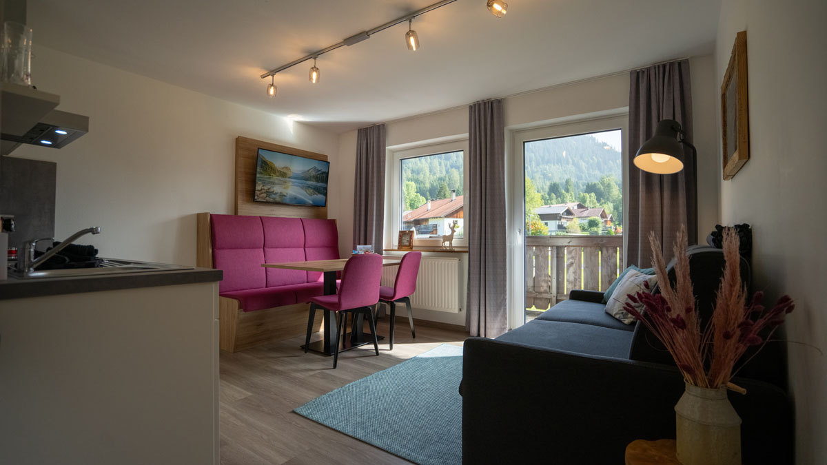 Im Sommer blickst du von jedem Appartement auf blühende Alpenwiesen und bewaldete Hänge, während die höchsten Gipfel dahinter zu neuen Abenteuern einladen, sichtbar von deinem Balkon, deiner Terrasse oder unserem Garten.